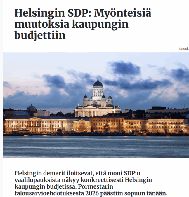 Demokraatti 30.10. / Helsingin demarit iloitsevat, että moni SDP:n vaalilupauksista näkyy konkreettisesti Helsingin kaupungin budjetissa. Pormestarin talousarvioehdotuksesta 2026 päästiin sopuun tänään.