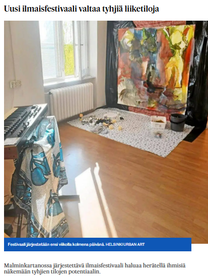 Helsingin Uutiset 1.11. / Tyhjiä liiketiloja aiotaan ottaa taiteilijoiden käyttöön ensimmäistä kertaa järjestettävän festivaalin ajaksi Malminkartanossa.