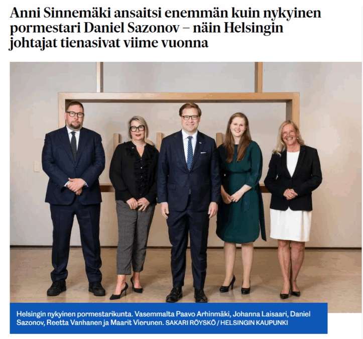 Helsingin Sanomat 10.6. / Viime viikolla ryhmäkuviin järjestäydyttiin Helsingissä, jossa pormestarin paikka meni kuntavaaleissa täpärästi suurimmaksi puolueeksi selvinneen kokoomuksen Daniel Sazonoville. Apulaispormestareiksi valittiin Johanna Laisaari (sd), Reetta Vanhanen (vihr), Maarit Vierunen (kok) ja Paavo Arhinmäki (vas).
