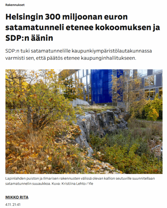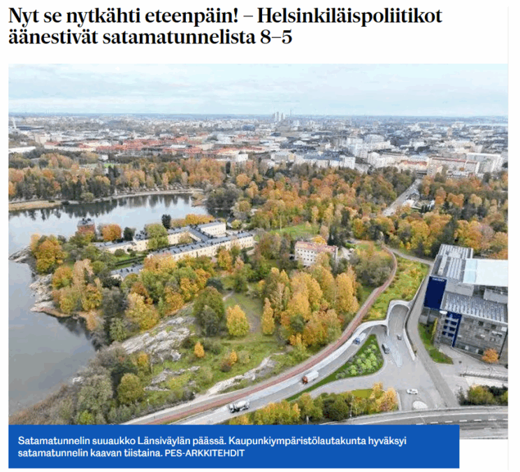Helsingin Uutiset 4.11. / Pitkään valmisteilla ollut Helsingin satamatunneli etenee seuraavaksi kaupunginhallituksen päätöksentekoon. Kaupunkiympäristölautakunta hyväksyi tunnelin asemakaavan kokouksessaan tiistai-iltana (4.11.).