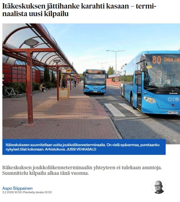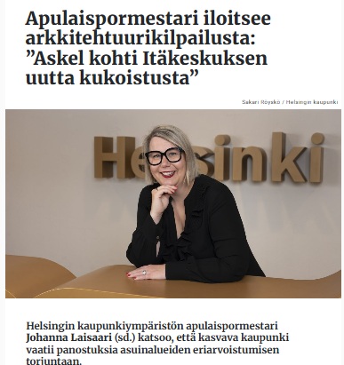 Helsingin Uutiset 3.2. / Itäkeskuksen joukkoliikenneterminaalin kehittämisen toteutus arkkitehtuurikilpailun avulla on yksi konkreettinen askel kohti Itäkeskuksen uutta kukoistusta, kaupunkiympäristön apulaispormestari Johanna Laisaari.