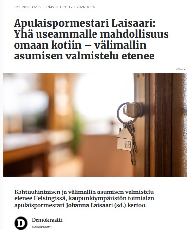 Demokraatti 12.1. / Apulaispormestari Laisaari: Yhä useammalle mahdollisuus omaan kotiin – välimallin asumisen valmistelu etenee