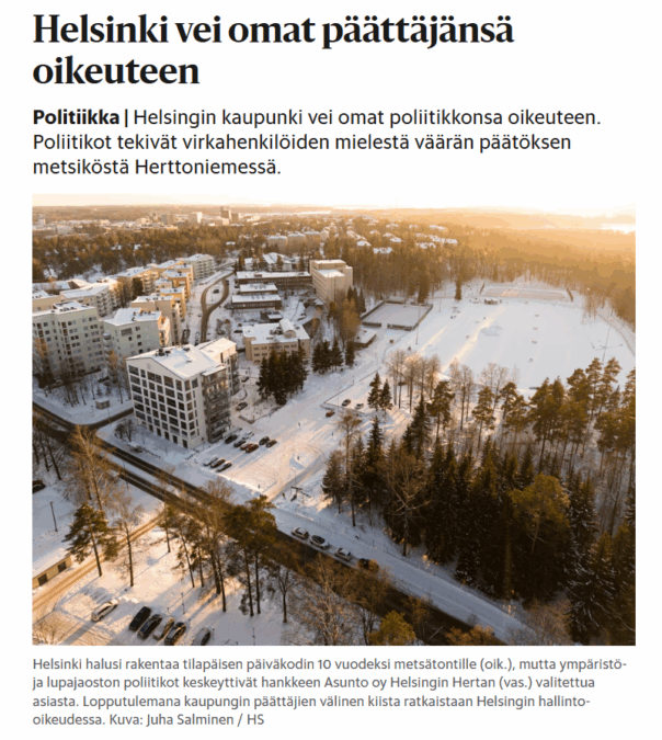 Helsingin Uutiset 3.9. / Kaupunkiympäristölautakunnan poliitikot puuttuivat tiistain kokouksessaan kaavamuutosasiaan, joka olisi mahdollistanut osin 4-kerroksisen ja osin 5-kerroksisen asuintalon rakentamisen Veräjämäkeen.