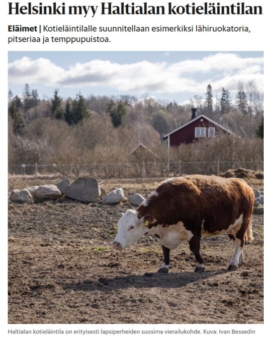 Helsingin Sanomat 10.2. / Helsingin kaupunkiympäristönlautakunta päätti tiistain kokouksessaan myydä Haltialan kotieläintilan. Päätös on yksimielinen. Äänestyksessä meni läpi vastaehdotus, johon on lisätty täydennys eläinten kohtelusta ja maksuttomuudesta.
