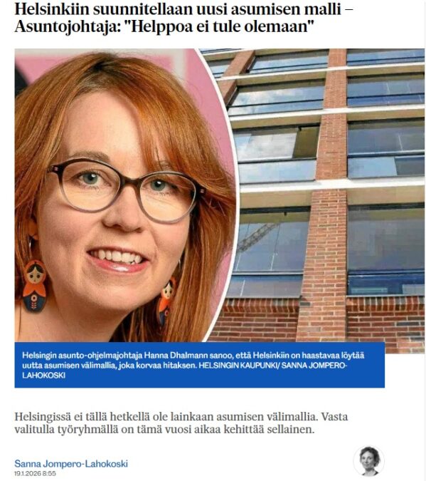 Helsingin Uutiset 19.1. / Helsingissä ei tällä hetkellä ole lainkaan asumisen välimallia. Vasta valitulla työryhmällä on tämä vuosi aikaa kehittää sellainen.
